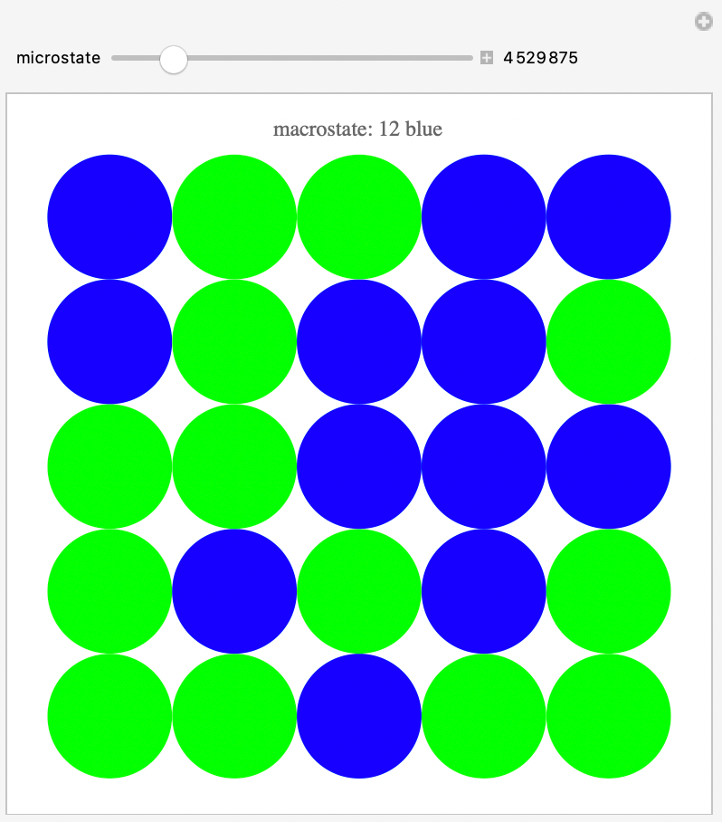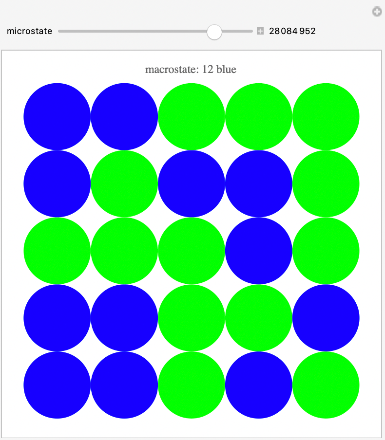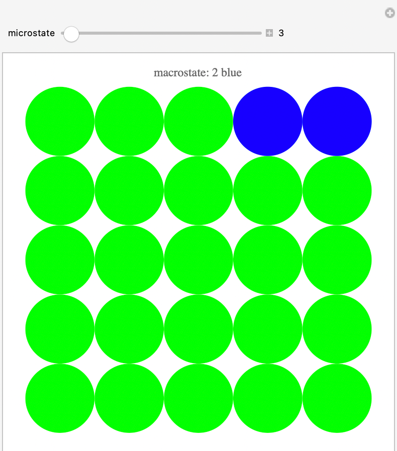 - Consider a system of 25 circles, green or blue. The macrostates of the system are the number of blue circles, from 0 to 25 (total 26). The microstates are the color combinations of the circles, from 0 to 33554431 (total 33554432).