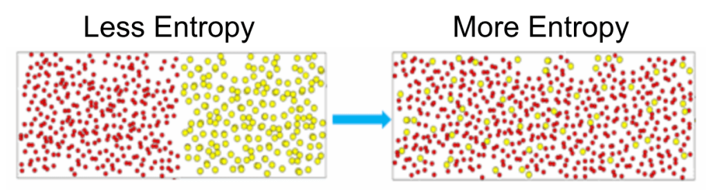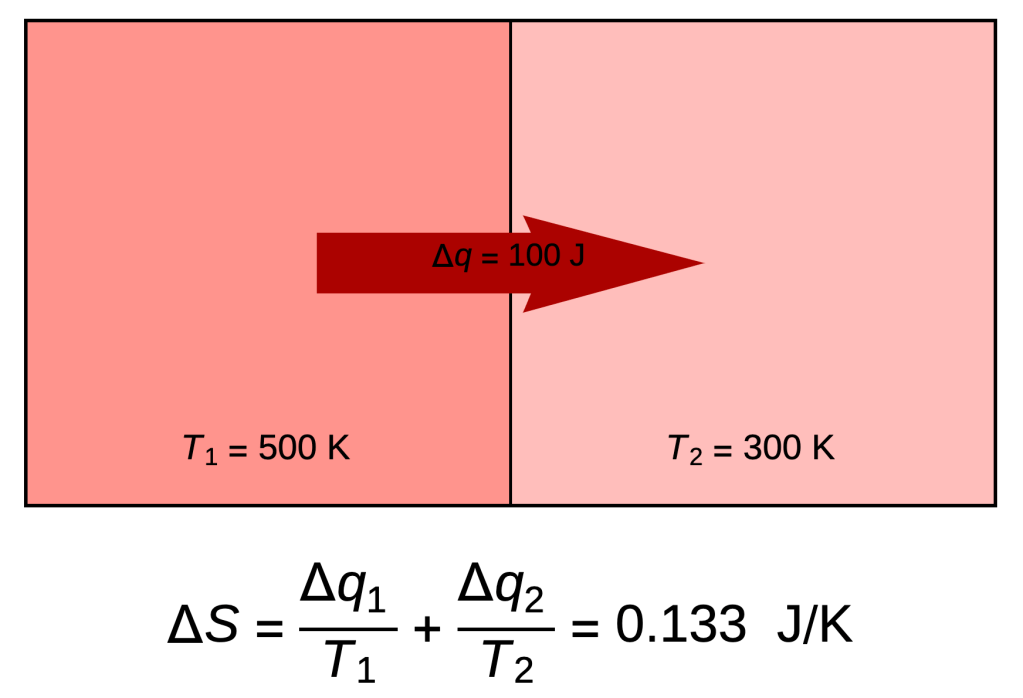 - As the molecules mix and mingle, the system undergoes an increase of entropy ΔS = -100/500 + 100/300 = 0.133 Joules / Kelvin.