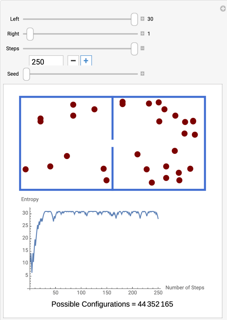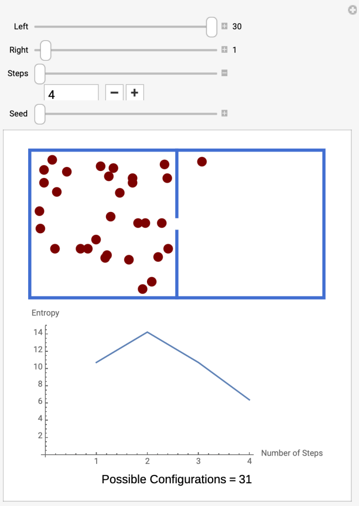 - At the beginning (Step 4) there are 30 molecules in the left compartment and 1 in the right. The graph shows the entropy at 6.