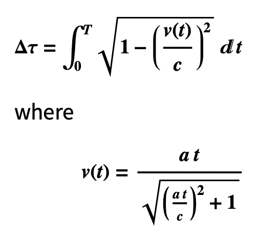 - Formula for Alice’s elapsed proper time Δτ for a period of T seconds at acceleration = a in Bob’s frame (Wikipedia):