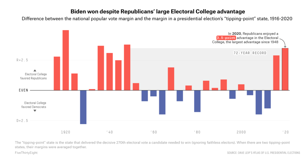- By now, Democrats’ disadvantage in the Electoral College is well-documented. President Joe Biden won the national popular vote by 4.5 percentage points, yet he won Wisconsin — the state that gave him his decisive 270th electoral vote1 — by only 0.6 points. In other words, Biden needed to beat former President Donald Trump nationally by more than 3.8 points2 in order to win the White House outright. (However, Trump wouldn’t have won outright unless Biden had won the popular vote by fewer than 3.2 points, thus losing Pennsylvania as well.3 The Electoral College’s Republican bias in 2020 thus averaged out to 3.5 points — but either way, it’s the most out of sync the Electoral College has been with the popular vote since 1948.)
