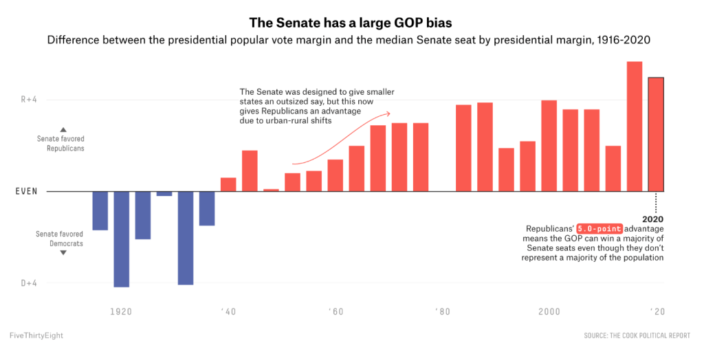 - Last year, despite Biden winning the national popular vote by 4.5 points, Trump won the median Senate seat4 by 0.5 points. That 5.0-point Republican lean makes the Senate the most biased institution in the federal government.