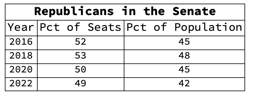 - In fact, Republican senators have not represented a majority of the population since 1999 — yet, from 2003 to 2007 and again from 2015 to 2021,5 Republicans had a majority of members of the Senate itself. That means that, for 10 years, Republican senators were passing bills — and not passing others — on behalf of a minority of Americans.