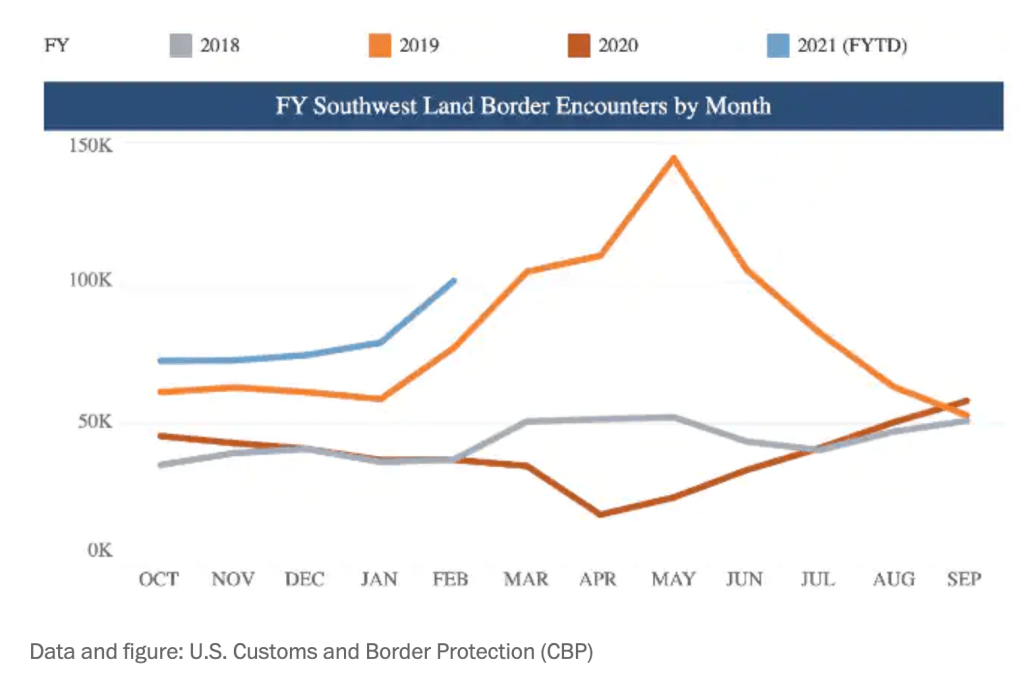 - Immigration experts, writing in the Washington Post, agree that “the current increase in apprehensions fits a predictable pattern of seasonal changes in undocumented immigration combined with a backlog of demand because of 2020’s coronavirus border closure.”